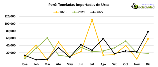 No hay ni hubo escasez de fertilizantes. Una opinión equivocada muy difundida atribuye los precios altos de urea a una supuesta “escasez” ocasionada por la guerra. Como se verificó, no hubo escasez de fertilizantes. Nuevamente la urea como indicador lo demuestra, si se observa las importaciones peruanas de urea durante el 2022, se verifica que no hubo escasez, incluso algunos meses del 2022 se importó más urea que en años anteriores (2020 y 2021). No fue problema de disponibilidad de oferta, sino de precios altos.