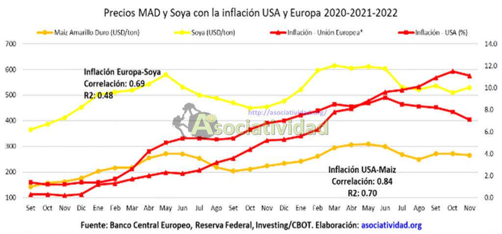 La misma situación fue verificada a nivel de diferentes productos de seguridad alimentaria. Los precios de commodities como el maíz amarillo o la soya demostraron correlaciones superiores al 84% con la inflación de las principales economías occidentales (USA y Europa). No se trata de un problema de escasez, sino de un problema financiero.