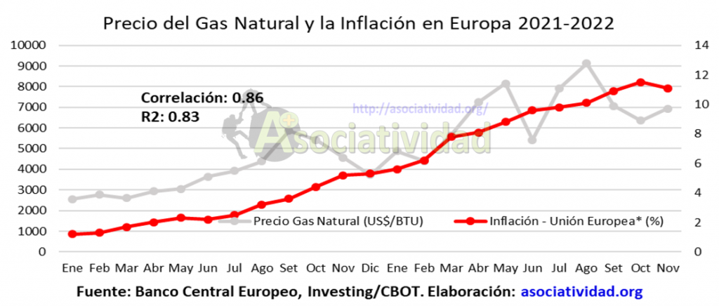 El impacto de la inflación sobre los fertilizantes (urea) es más evidente al analizar la correlación entre la inflación y el precio del gas natural, insumo determinante para la fabricación de la urea, la cual llega al 86%.