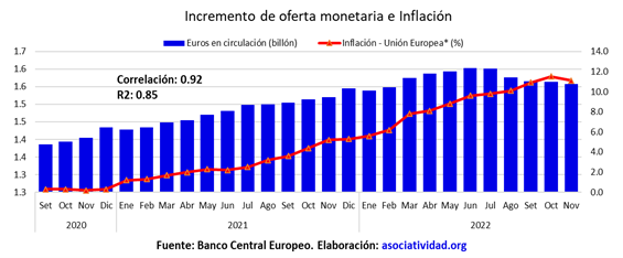 La naturaleza del problema. Este no es, nunca fue, un problema de escasez de urea, ni de materias primas, pues no hay problemas en el abastecimiento de estos productos, sino que se trata de un problema financiero originado por la inflación provocada por la impresión de dinero realizado por los Bancos Centrales, por ejemplo, el BCE en Europa y por la Reserva Federal en USA. Lo cual ha afectado a los precios de materias primas. Aunque han existido factores de coyuntura, como la explosión de la planta de gas de Freeport LNG, o sequías localizadas en algunos países, el impacto de estos no ha tenido el alcance de la inflación, lo que puede verificarse, por ejemplo, en la alta correlación (92%) entre los euros en circulación y la inflación en Europa para los periodos analizados (ver siguiente gráfico).