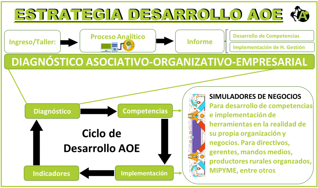 La Estrategia DAOE se compone de un Diagnóstico a través del Software AOE, que comprende buenas prácticas e integra información financiera, operativa y comercial; integrado con talleres de trabajo, donde los actores clave de la organización diagnostican su propia realidad. Así como por el Ciclo de Desarrollo DAOE, que comprende el desarrollo de competencias a través de Simuladores de Negocios, donde los participantes aplican herramientas en su propia realidad (a diferencias de otras metodologías donde entrenan con realidades diferentes y esperan que cada quien «lo adapte» a sus realidad). Los que asegura el formación de competencias y con la implementación de herramientas que son identificadas por diagnósticos AEO. Nuestros servicios incluyen: